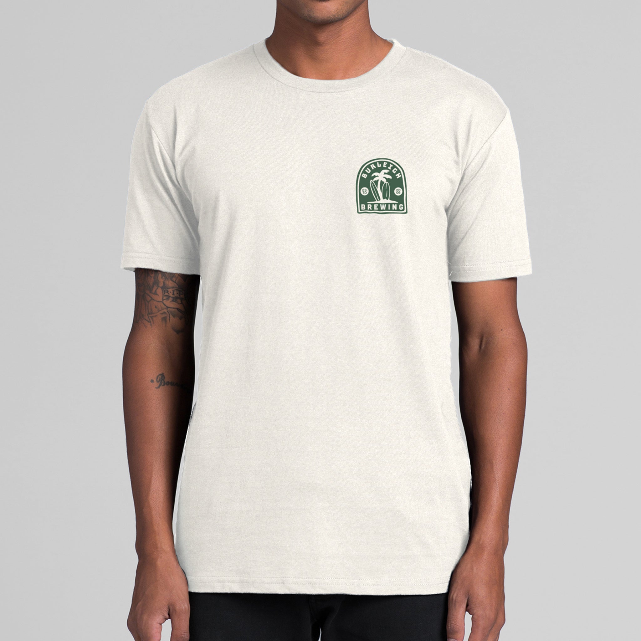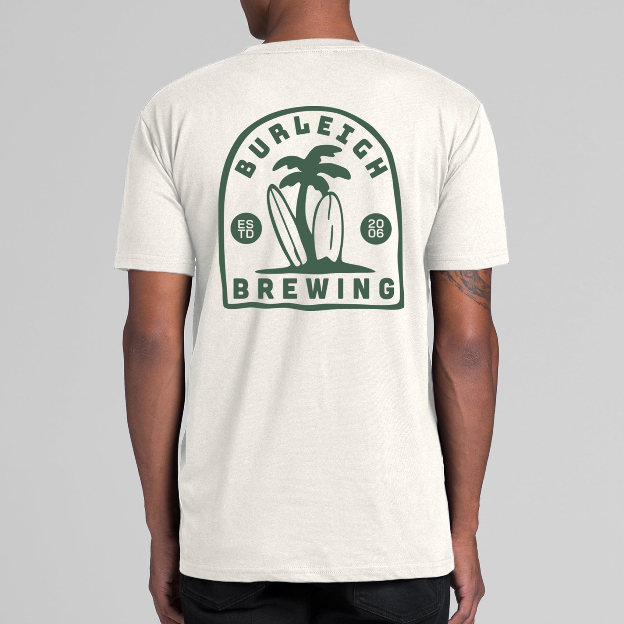 The Burleigh Badge Tee is a clean, comfortable classic that reps your favourite brewery with laid-back style. Made from soft, 100% combed cotton in a natural tone, this unisex tee features our signature wave badge patch on the front — complete with surf, sun, and palm tree details — and a bold Burleigh Brewing graphic on the back.