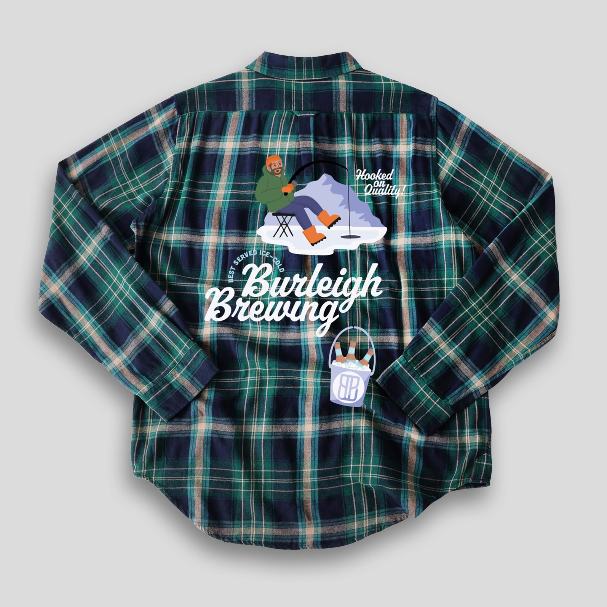 Made from 100% cotton soft brushed flannel—the Hooked on Quality Flannel is warm and cozy without being overly heavy. A contemporary casual cut for easy layering or standalone wear for our Burleigh winters. Featuring a playful ice fishing back print and vintage inspired typography in a classic green plaid pattern, it’s a nod to the great outdoors and beers best served ice cold.