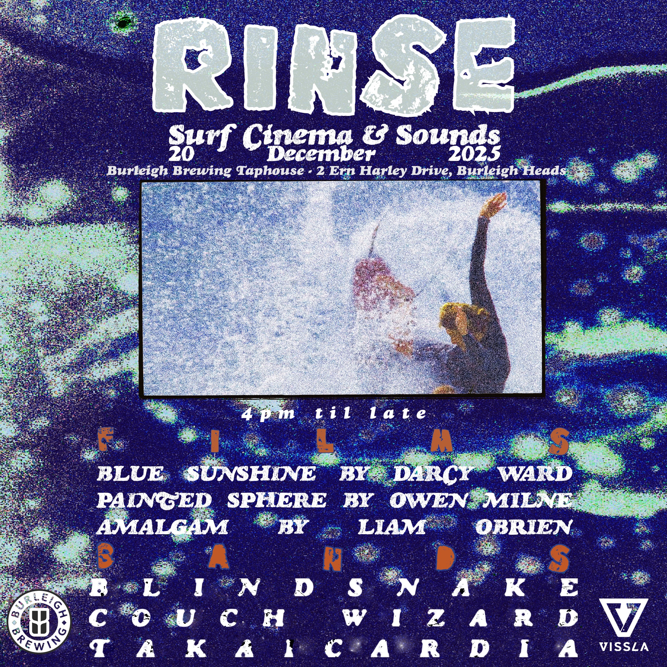 Kicking off at 4pm with surf films from Liam O'Brien, Owen Milne and Darcy Ward followed by live music from Blindsnake, Couch Wizard and Takaicardia. We’ll be giving away beer prizes every hour on the hour as well as goodies from Vissla.